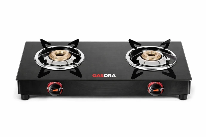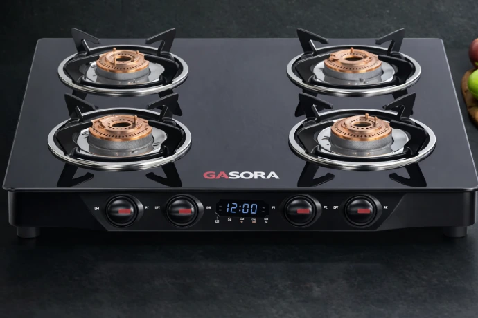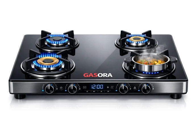 Here is your state-of-the-art Gasora brand gas stove—featuring a sleek black glass top, a digital control panel, four brass burners, and blue LED knobs.